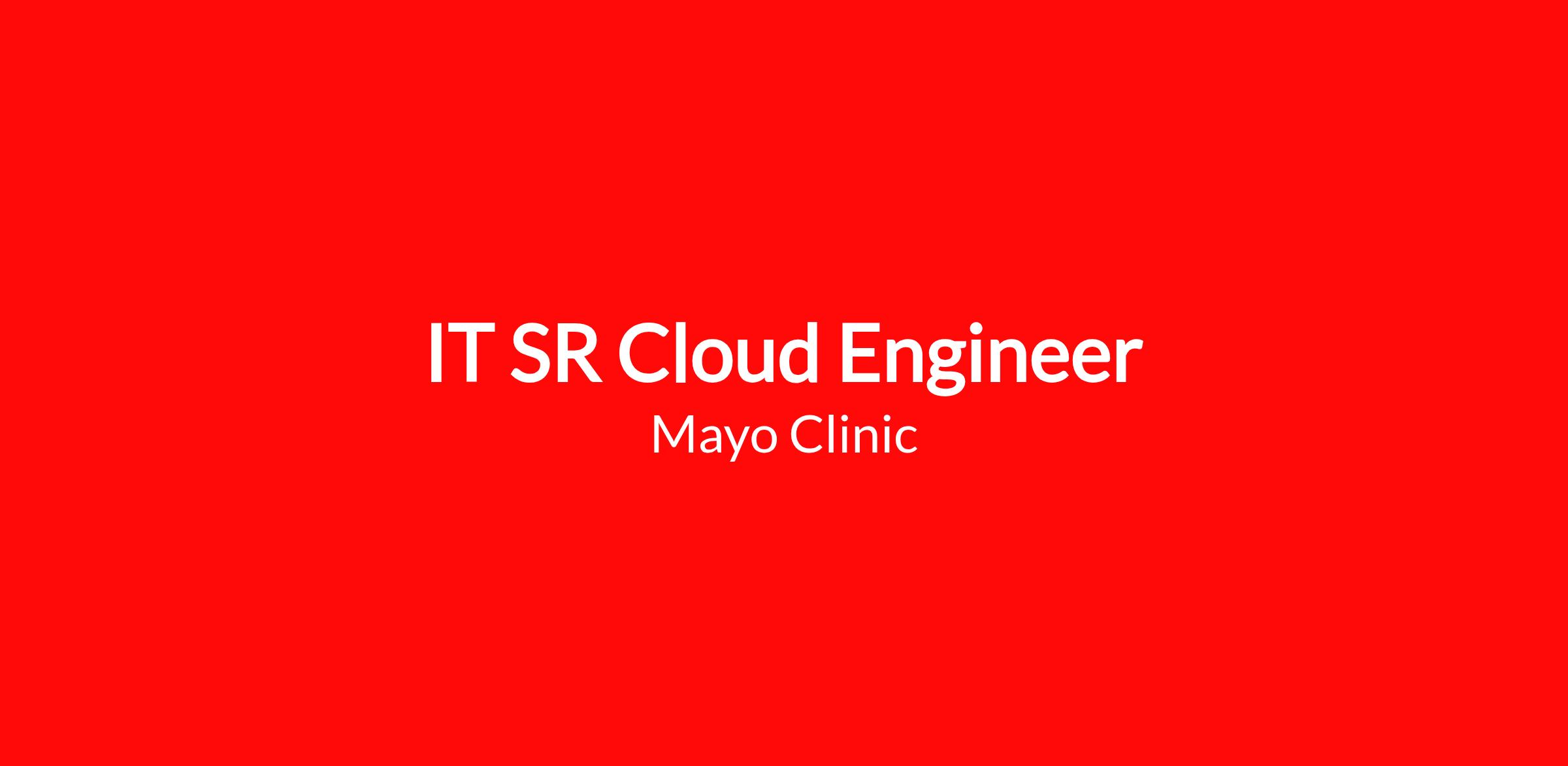 Bachelor’s degree with 5 years’ demonstrated technical experience and 1 year of demonstrated leadership experience, or Associate’s degree with 7 years’ experience and 1 year of demonstrated leadership experience, or HS/GED with 9 years of experience and 1 years’ of demonstrated leadership experience in a large, complex organization like Mayo Clinic may be considered in lieu of the degree. Demonstrated ability to work across multiple environments including cloud and on-premise, and multiple operating systems. Functional understanding of cloud ecosystem and leading-edge cloud emerging technologies. Working knowledge of the practical application of engineering and technology including applying principles, techniques, procedures, hardware and tools to the design and production of various products and services. Working knowledge of data center design best practices. Knowledge of and ability to apply DevOps principles and ways of working. Ability to develop and deliver requirements, concepts of operations, use cases, demonstrations, and presentations to both one-to-one and in small groups. Knowledge of approaches, tools, and techniques for anticipating, recognizing, managing, and resolving technical (hardware, software, application, or operational) problems. Ability to effectively communicate with and present to senior management and executive stakeholders (e.g., IT Leadership). Certification in cloud engineering is required.